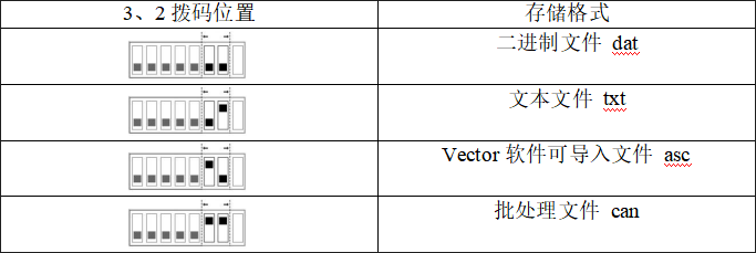 CAN總線數(shù)據(jù)存儲(chǔ)器支持四種保存數(shù)據(jù)格式:二進(jìn)制文件(.DAT)、文本文件(.TXT)、Vector軟件可導(dǎo)入文件(.ASC)、批處理文件(.CAN)可通過8位撥碼開關(guān)中的第三和二個(gè)開關(guān)切換,如圖所示。