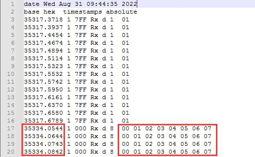 第一列:數(shù)據(jù)時(shí)間(接收數(shù)據(jù)當(dāng)天的絕對(duì)時(shí)間,從零點(diǎn)零分零秒開始計(jì)算,單位:s)例:35334.0544表示當(dāng)天9時(shí)48分54秒第二列:CAN通道,1表示CAN1,2表示CAN2第三列:CAN ID第四列:數(shù)據(jù)類型(默認(rèn)為Rx)第五列:幀類型(d是數(shù)據(jù)幀,r是遠(yuǎn)程幀)第六列:幀數(shù)據(jù)長(zhǎng)度第七列之后:幀數(shù)據(jù)