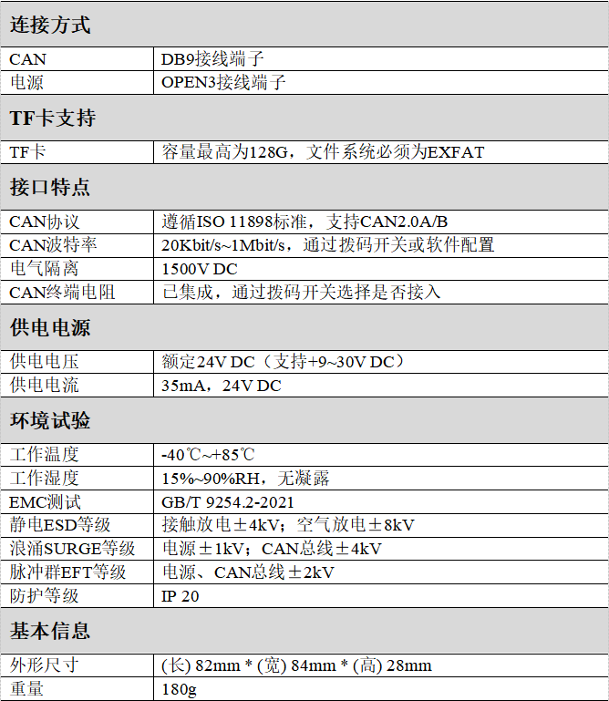 (1)高速的32位工業(yè)級(jí)處理器;(2)使用外接電源供電(9~30V DC);(3)供電電流:35mA,額定24V DC;(4)集成2路標(biāo)準(zhǔn)CAN總線接口,使用DB9接線端子;(5)CAN總線支持CAN2.0A、CAN2.0B幀格式,符合ISO/DIS 11898標(biāo)準(zhǔn);(6)CAN總線通訊波特率在20Kbps~1Mbps之間可通過撥碼開關(guān)或軟件配置;(7)CAN總線接口采用電氣隔離,隔離模塊絕緣電壓:1500V DC;(8)最高接收數(shù)據(jù)流量:8000 fps/秒;(9)CAN數(shù)據(jù)帶有時(shí)間戳,精度0.1ms;(10)存儲(chǔ)卡最大支持128G;(11)工作溫度范圍:-40℃~+85℃;(12)靜電放電抗擾度等級(jí):接觸放電±4KV,空氣放電±8KV;(13)電快速瞬變脈沖群抗擾度等級(jí):±2KV;(14)浪涌抗擾度等級(jí):電源接口±1KV。CAN總線接口±4KV;(15)工作濕度范圍:5%~95%RH無凝露;