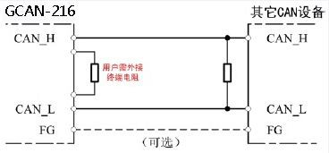 請注意:GCAN-216模塊內(nèi)部未集成120Ω終端電阻,模塊外部提供電阻接線端子。需要接入終端電阻時,將電阻兩端分別接入CAN_L、CAN_H即可。