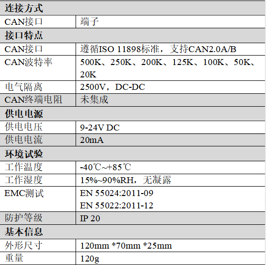 GCAN-216模塊使用時不需要修改波特率,屬于自適應(yīng)形式,波特率支持范圍為10K-500K,輸入和輸出波特率必須一致。設(shè)備使用時只需接好CAN線和電源線。(接線為CANH-CANH,CANL-CANL,供電電壓為DC9-24V)六、技術(shù)規(guī)格