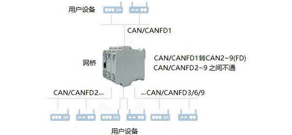 ● 網(wǎng)橋系列GCAN-GT-418產(chǎn)品,具有3/6/9個(gè)電氣隔離的CAN/CANFD總線接口,1路以太網(wǎng)接口。CAN/CANFD1作為主節(jié)點(diǎn),CAN/CANFD 2~3/2~6/2~9作為從節(jié)點(diǎn),每個(gè)從節(jié)點(diǎn)最多可以帶32個(gè)CAN設(shè)備。主節(jié)點(diǎn)和從節(jié)點(diǎn)的波特率可以自由配置,實(shí)現(xiàn)CAN/CANFD網(wǎng)絡(luò)的網(wǎng)橋功能,可以將不同速率的CAN/CANFD網(wǎng)絡(luò)數(shù)據(jù)轉(zhuǎn)發(fā)到CAN/CANFD1通道;