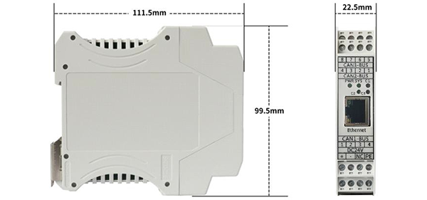 GCAN-GT-418-3/3R/3C的設(shè)備外形尺寸:(長(zhǎng),含接線端子)111.5mm*(寬)22.5mm*(高)99.5mm,其示意圖如圖所示。注:GCAN-GT-418-6/6R/6C設(shè)備寬45mm,GCAN-GT-418-9/9R/9C設(shè)備寬67.5mm。長(zhǎng)和高與GCAN-GT-418-3/3R/3C型號(hào)一致。GCAN-GT-418-3/3R/3C模塊尺寸圖