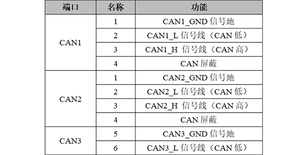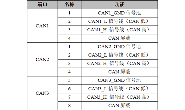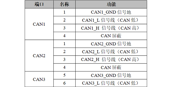 GCAN-GT-418-3系列模塊CAN/CANFD接口由3個(gè)4Pin接線端子引出,有3個(gè)獨(dú)立的CAN/CANFD接口,其接口定義如下表所示。