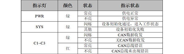 GCAN-GT-418-3系列模塊具有1個(gè)PWR指示燈、1個(gè)SYS指示燈、3個(gè)CAN總線狀態(tài)指示燈。