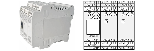 GCAN-GT-418-9系列模塊具有1個(gè)PWR指示燈、3個(gè)SYS指示燈、9個(gè)CAN總線狀態(tài)指示燈。