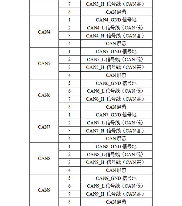 GCAN-GT-418-9系列模塊CAN/CANFD接口由9個(gè)4Pin接線端子引出,有9個(gè)獨(dú)立的CAN/CANFD接口,其接口定義如下表所示。