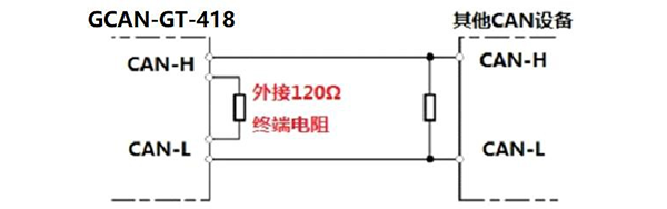 請(qǐng)注意:GCAN-GT-418系列模塊的CAN總線內(nèi)部未集成120Ω終端電阻。如果節(jié)點(diǎn)數(shù)目大于2,中間節(jié)點(diǎn)不需要安裝120Ω的終端電阻。需要使用時(shí),將電阻兩端分別接入CAN_H、CAN_L即可,如下圖所示。