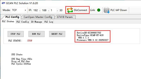 (1)打開GCAN_PLC_Solution軟件,Mode選擇TCP模式,418的網(wǎng)口連接上位機(jī),輸入418的IP地址(出廠默認(rèn)192.168.1.30),點(diǎn)擊“Connect”按鈕。連接成功后會(huì)顯示418的相關(guān)參數(shù)信息。