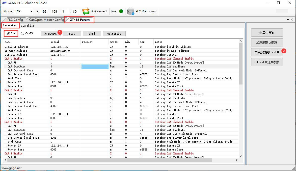 (2)點(diǎn)擊“GT418 Param”標(biāo)簽頁。選擇配置“Can模式”或“CanFD模式”,這里以Can模式為例,“ReadPara”可以獲取當(dāng)前418設(shè)備內(nèi)的參數(shù),包括波特率、Tcp模式、目標(biāo)IP等參數(shù),在“request”列寫入想修改的參數(shù)后,點(diǎn)擊右側(cè)“保存參數(shù)到Flash中”,“重啟動(dòng)設(shè)備”或設(shè)備手動(dòng)重啟后配置生效;若想恢復(fù)出廠設(shè)置,請(qǐng)點(diǎn)擊“還原成默認(rèn)參數(shù)”后,點(diǎn)擊“保存參數(shù)到Flash中”,“重啟動(dòng)設(shè)備”或設(shè)備手動(dòng)重啟后配置生效。