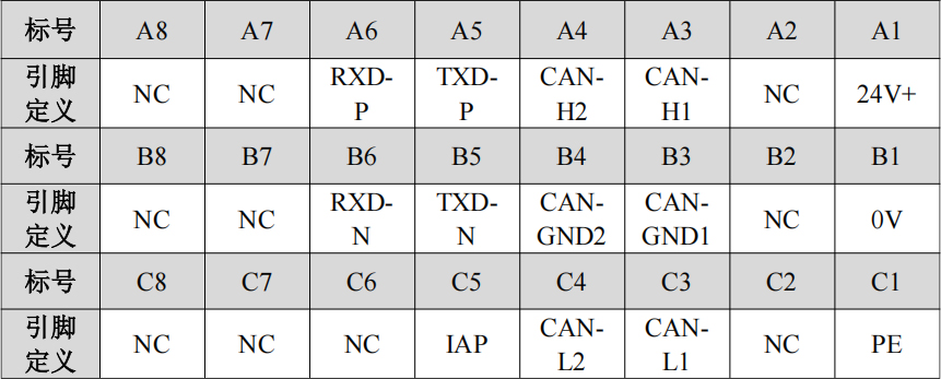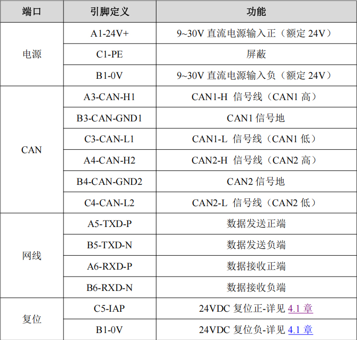 電源、CAN總線、網(wǎng)線接口位置,接口定義如表所示。