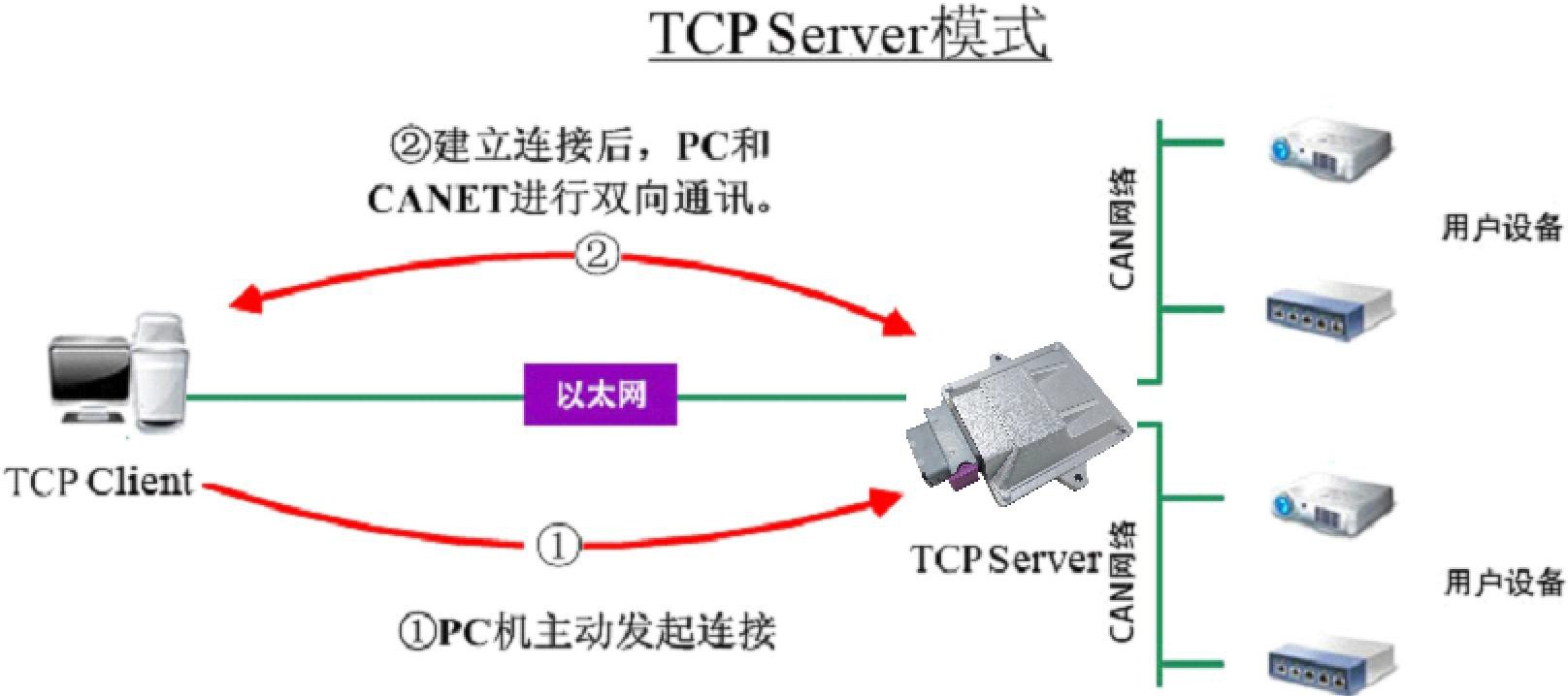 在TCP服務(wù)器(TCP Server)模式下,GCAN-212-W不會(huì)主動(dòng)與其它設(shè)備連接。它始終等待客戶端(TCP Client)的連接,在與客戶端建立TCP連接后即可進(jìn)行雙向的數(shù)據(jù)通信。建立通訊的過程如圖3.3所示。