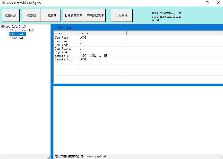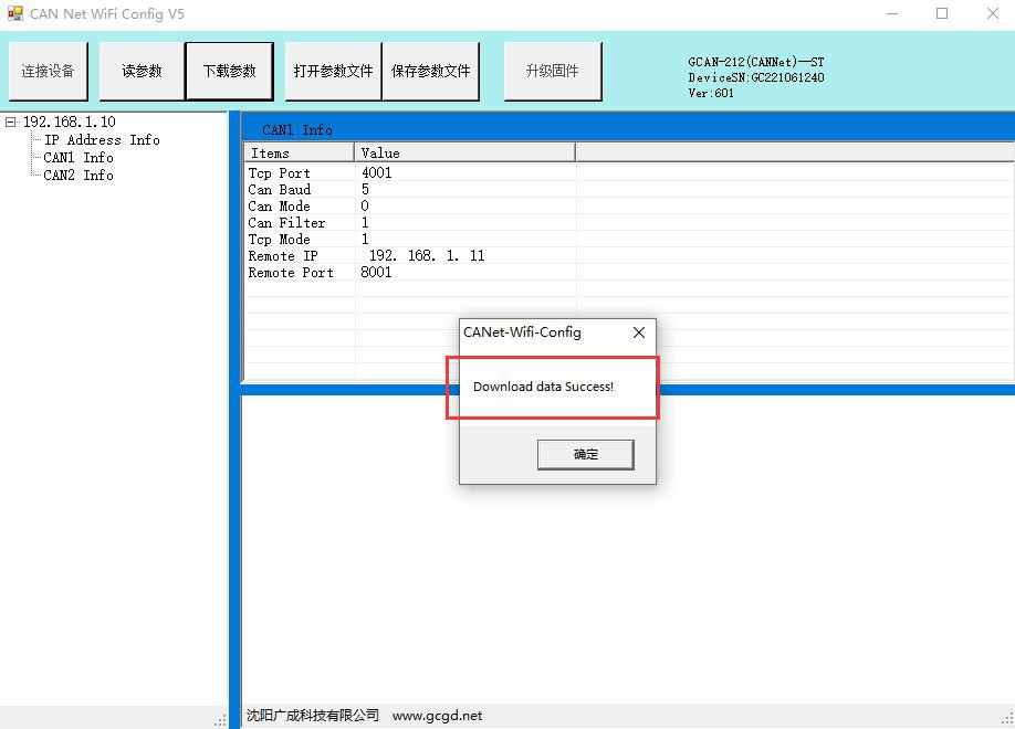 當(dāng)用戶對(duì)某一參數(shù)進(jìn)行修改后,該部分將在軟件中變成紅色。當(dāng)用戶配置完成后點(diǎn)擊“下載參數(shù)”即可將配置信息下載到GCAN-212-W的Flash中。