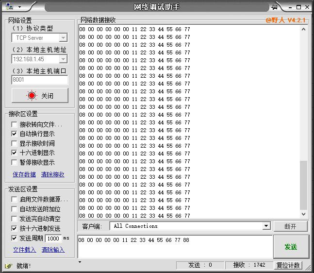 我公司向用戶提供Net Assist網(wǎng)絡(luò)調(diào)試助手軟件,該軟件可供用戶測(cè)試GCAN-212-W在TCP Server、TCP Client、UDP模式下的收發(fā)功能。