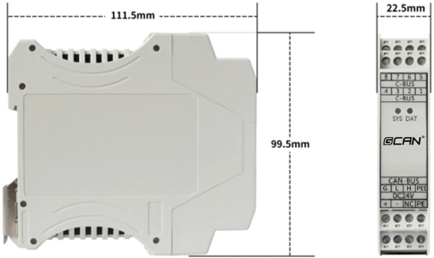 設(shè)備外形尺寸:(長(zhǎng),含接線端子)111.5mm*(寬)22.5mm*(高)99.5mm,其示意圖如圖2.2所示。