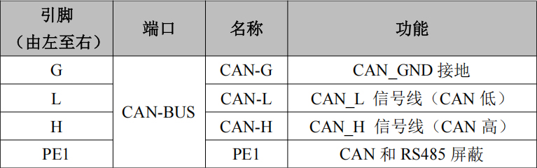 GCAN-204C模塊CAN總線接口由1個(gè)4 PIN接線端子引出,可以用于連接1個(gè)CAN-bus網(wǎng)絡(luò)或者CAN總線接口的設(shè)備,其接口定義如表2.2所示。