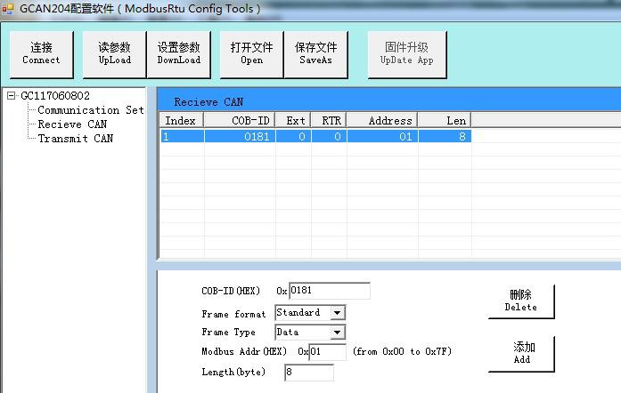 例如:配置Modbus從站地址為1,Modbus寄存器首地址為0x01(出廠預(yù)設(shè)值),功能碼為03,CAN為標(biāo)準(zhǔn)幀,幀ID為0x181,CAN幀數(shù)據(jù)為0x01,0x02,0x03,0x04,0x05,0x06,0x07,0x08。