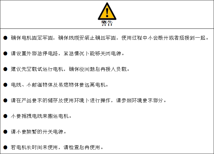建議電機先進行空載操作,試轉沒問題后,再加入負載進行操作,若試轉過程中,電機噪音過大,抖動過大,或者有任何報警情況,請與廠家聯(lián)系。