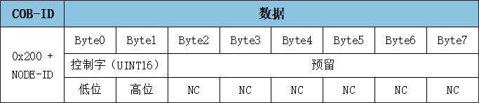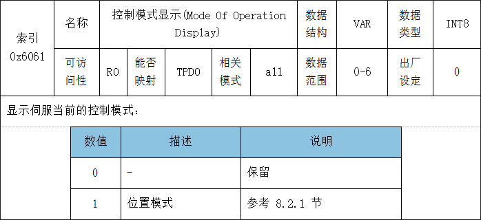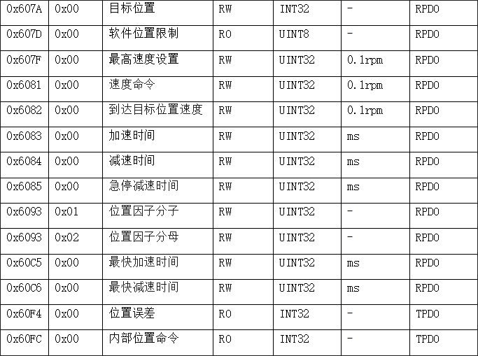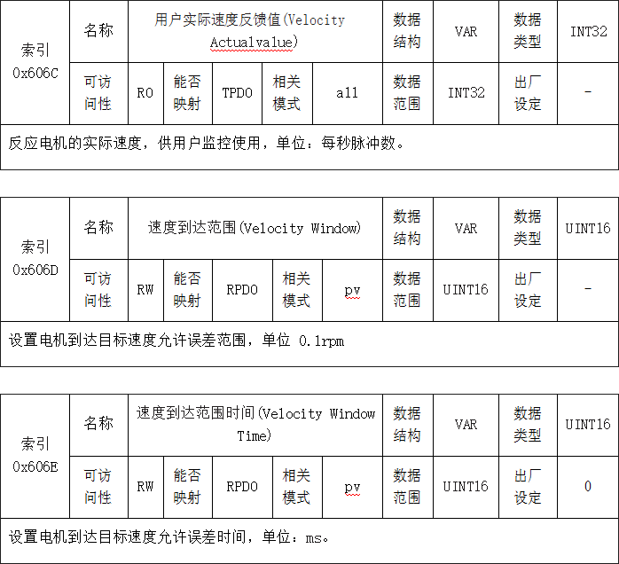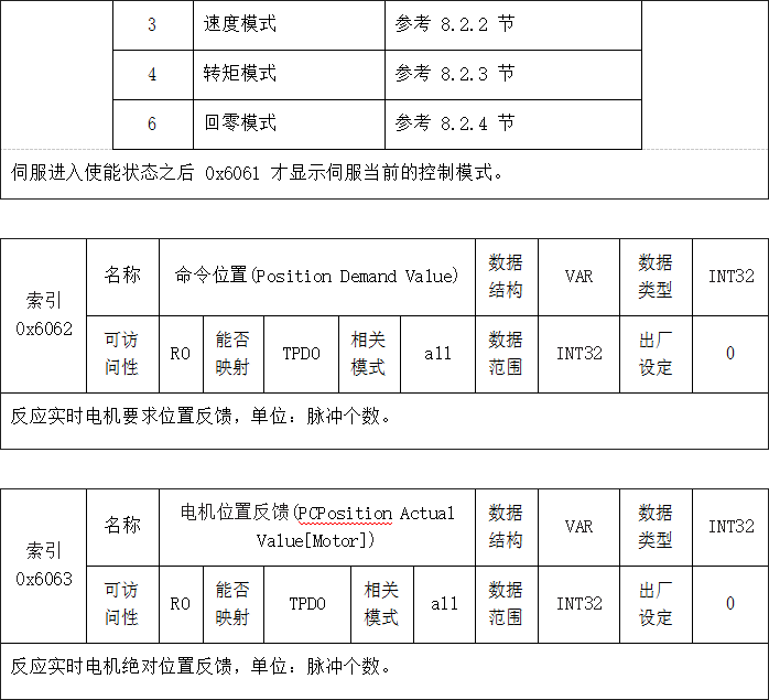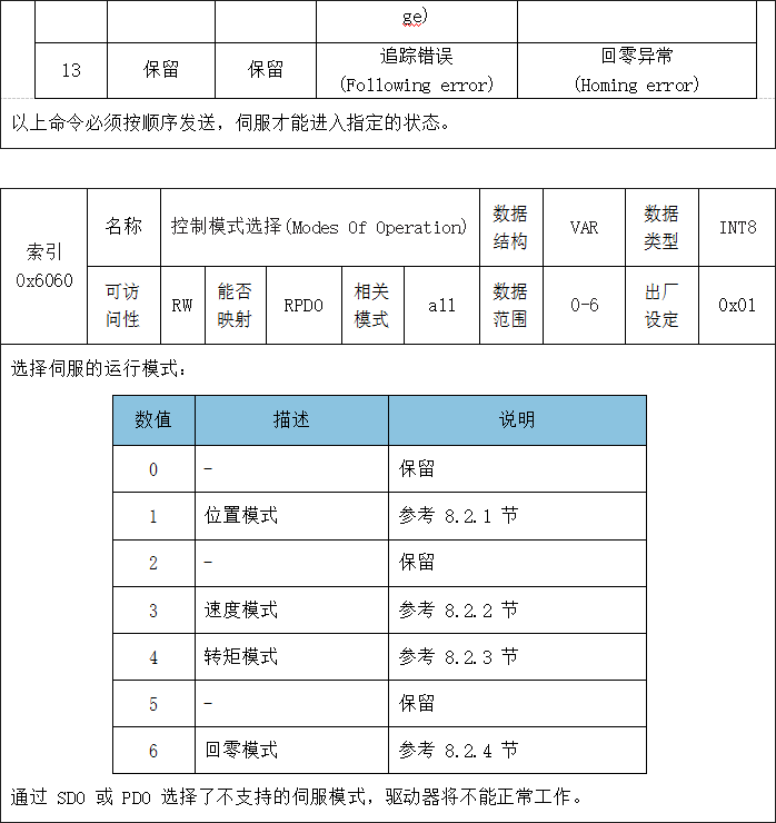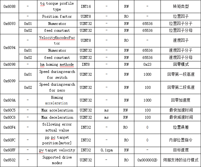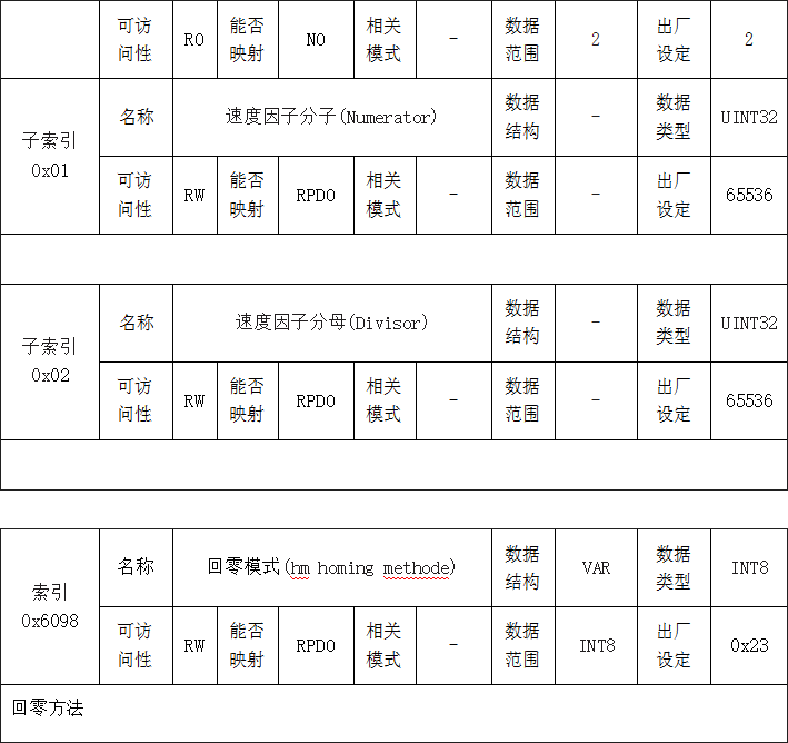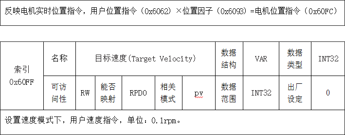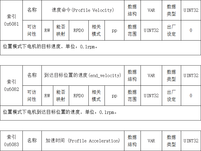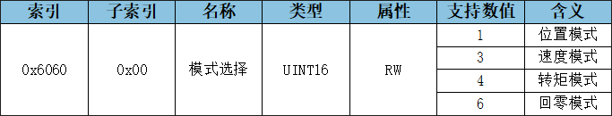 報文:ID:0x601數(shù)據(jù):2F 60 60 00 03 00 00 00,設置0x6060為3,設置運行模式為速度模式。