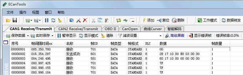 報文:ID:0x601數(shù)據(jù):2B 36 30 00 E8 03 00 00,設置截止時間為1000ms。