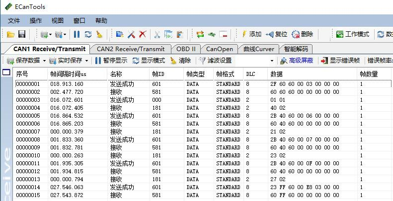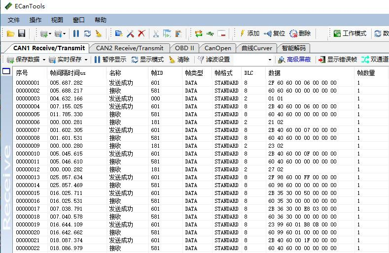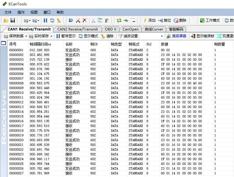 報文:ID:0x601數(shù)據(jù):23 FF 60 00 E8 03 00 00,單位0.1rpm,即轉速為1000*0.1rpm。
