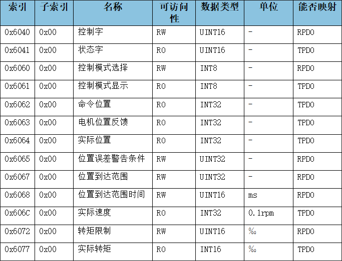 報文:ID:0x601數(shù)據(jù):2F 60 60 00 04 00 00 00,設置0x6060為4,設置運行模式為轉矩模式。