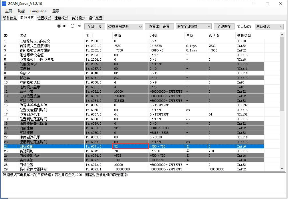 4、設置目標轉矩:索引Pn 6071.0輸入32,單位‰Tn。即以5%的轉矩運行。