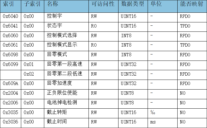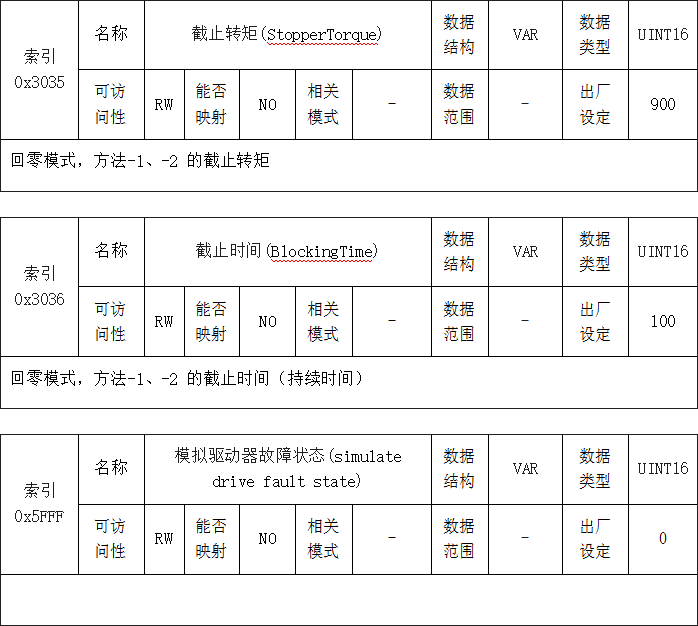 報文:ID:0x601數(shù)據(jù):2B 40 60 00 1F 00 00 00。驅動器首先以0x6099較快的速度向負方向移動,直到堵轉轉矩達到0x3035設定值且持續(xù)0x3036設定的時間后停止,然后將當前位置設為零點。