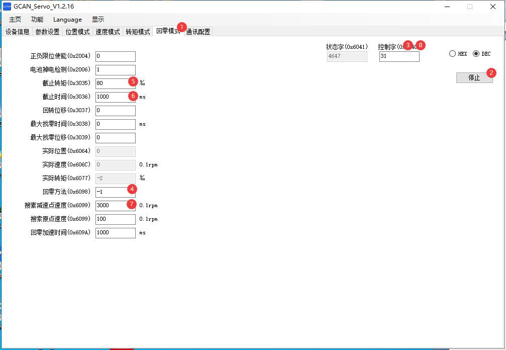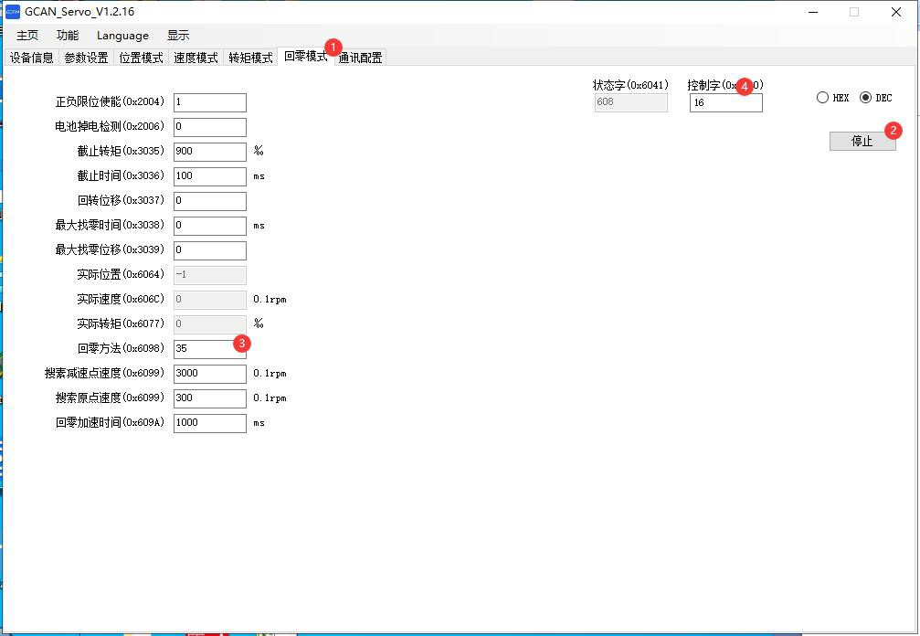 6、使能執(zhí)行:點擊當前頁面右上角“回零”按鈕,使電機開始運動。驅動器首先以0x6099較快的速度向負方向移動,直到堵轉轉矩達到0x3035設定值且持續(xù)0x3036設定的時間后停止,然后將當前位置設為零點。