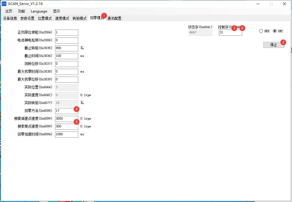 報文:ID:0x601數(shù)據(jù):2F 60 60 00 06 00 00 00,設置0x6060為6,設置運行模式為回零模式。