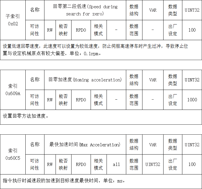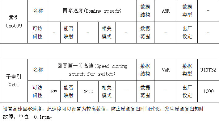報文:ID:0x601數(shù)據(jù):23 99 60 01 B8 0B 00 00,設置伺服回零第一段高速為3000*0.1rpm。