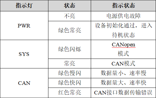 GCAN-4056模塊具有1個PWR指示燈、1個SYS指示燈、1個CAN指示燈來指示設(shè)備的運行狀態(tài)。這3種指示燈的具體指示功能及狀態(tài)如表所示。