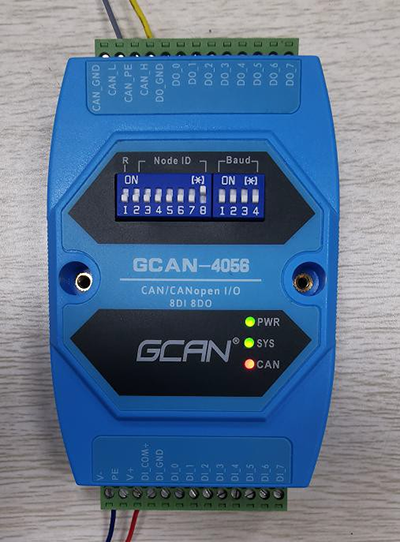 ● 默認CANopen模式,GCAN-4056模塊上電后,PWR、SYS、CAN三個指示燈立即點亮;