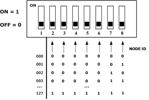 如下圖所示,撥碼開關(guān)的每個位撥向“ON”位置時,該位為“1”,如果撥向“OFF”位置,則該位為“0”。撥碼開關(guān)的2—8位用于設(shè)定模塊的節(jié)點號(NODE ID),第八位為最低位,第二位為最高位,模塊的節(jié)點號(NODE ID)是各位對應的十進制值之和,通過撥碼開關(guān)設(shè)定模塊的節(jié)點號(NODE ID)的有效范圍為0~127。