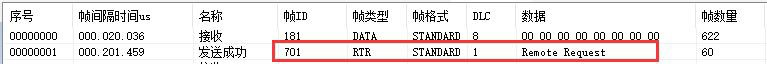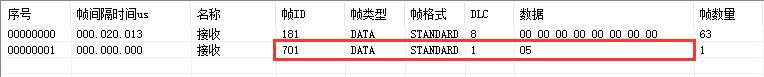 例如:默認GCAN-4056的Node ID為1(以下節(jié)點號均為1),則主站設(shè)備可接收到一條節(jié)點狀態(tài)數(shù)據(jù),幀ID為0x701,標準幀,數(shù)據(jù)為0x05。