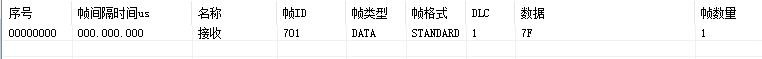 例如:默認GCAN-4056的Node ID為1(以下節(jié)點號均為1),則主站設(shè)備可接收到一條節(jié)點狀態(tài)數(shù)據(jù),幀ID為0x701,幀數(shù)據(jù)為0x7F。