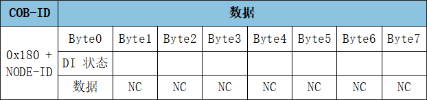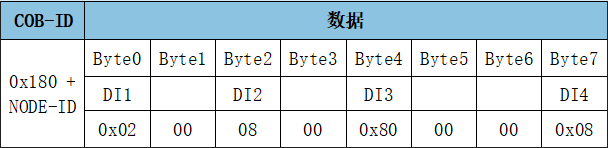 GCAN-4056模塊采用PDO(Process Data Object,過程數(shù)據(jù)對象)對數(shù)字量信號進行采集或?qū)懭胼敵觥I、DO每一路的具體位置均可自由配置。其中,TPDO1用于表示數(shù)字量DI狀態(tài),幀ID為0x180+Node ID,默認幀數(shù)據(jù)第一個字節(jié)為數(shù)字量輸入狀態(tài)。