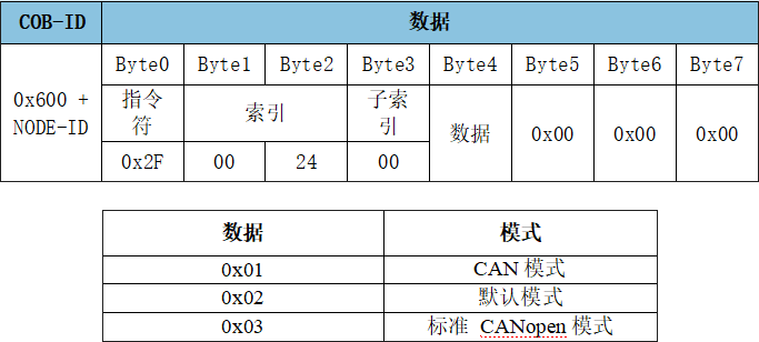 報文:ID:0x601數(shù)據(jù):2F 00 24 00 03 00 00 00,設(shè)置模塊為標準CANopen模式。
