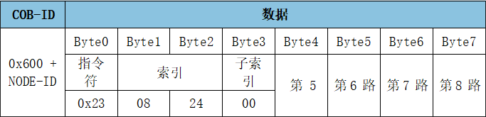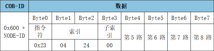 GCAN-4056模塊可通過發(fā)送SDO命令寫參數(shù),修改每一路DO的寫入位置。前4路傳輸類型的數(shù)據(jù)位于對象字典索引0x2403、子索引0x00,數(shù)據(jù)類型Unsigned32。