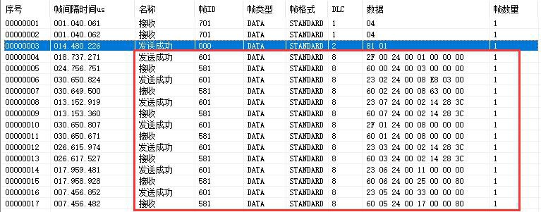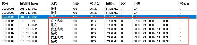 1、模塊配置為CAN模式報文:ID:0x601數(shù)據(jù):2F 00 24 00 01 00 00 00,設(shè)置模塊為CAN模式。