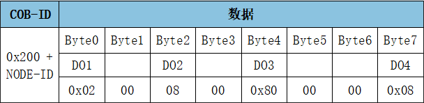 RPDO1用于表示改變(寫入)數(shù)字量輸出的狀態(tài),幀ID為0x200+Node ID,數(shù)字量輸出默認由一個字節(jié)來控制(寫入),DO4在高位,DO1在低位。RPDO1: