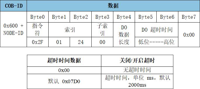 4、修改CAN模式下DO超時時間、數(shù)據(jù)長度報文:ID:0x601數(shù)據(jù):2F 01 24 00 08 00 00 00,設(shè)置模塊輸出長度為8個字節(jié),無超時時間。