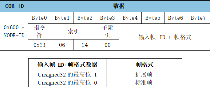 23 06 24 00 00 08 00 80,設(shè)置模塊輸入數(shù)據(jù)幀ID為0x00000800,幀格式為擴展幀。