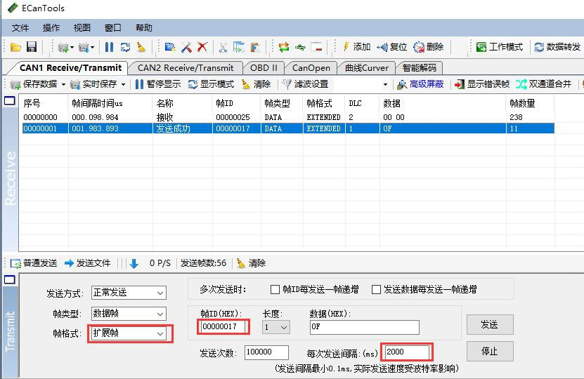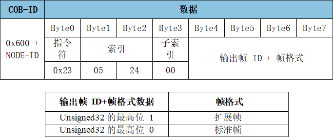 23 05 24 00 00 08 00 80,設(shè)置模塊輸出數(shù)據(jù)幀ID為0x00000800,幀格式為擴展幀。