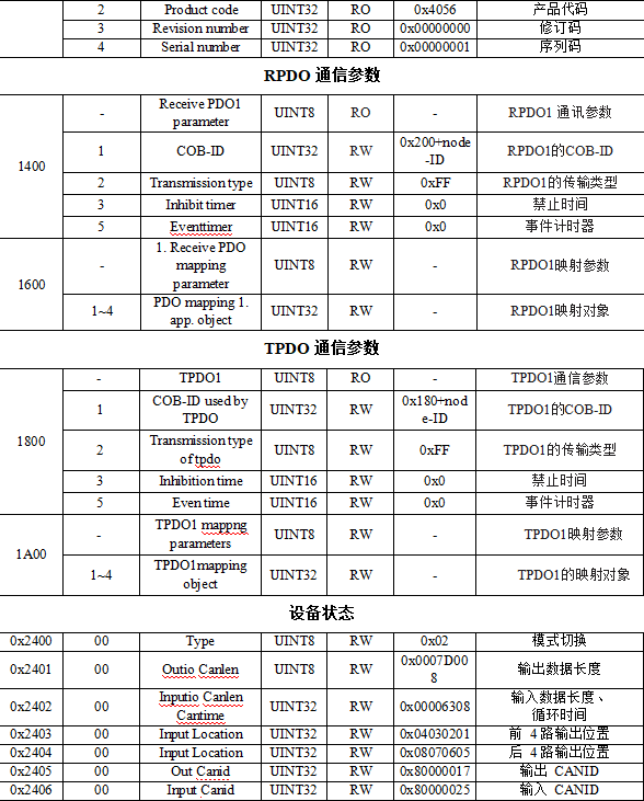 3、第4路在第60位可被寫入(設(shè)置),第3路在第40位可被寫入(設(shè)置),第2路在第20位可被寫入(設(shè)置),第4路在第2位可被寫入(設(shè)置)。RPDO1:幀ID為0x200+Node ID,用以寫入(設(shè)置)DO數(shù)據(jù)