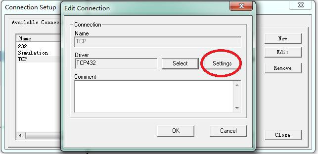 5、Driver中會(huì)顯示“TCP432”字樣,點(diǎn)擊“Settings(設(shè)置)”按鈕。