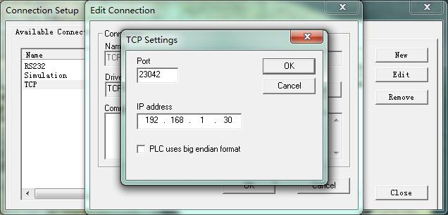 6、Port(端口)請(qǐng)輸入23042。IP地址為192.168.1.30,設(shè)置好后點(diǎn)OK