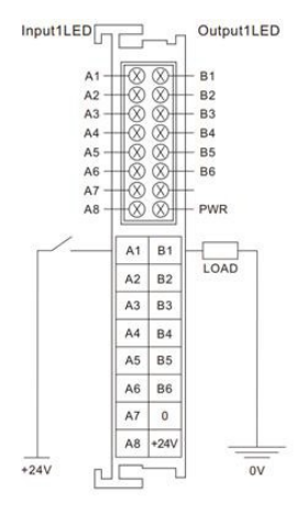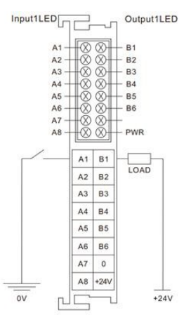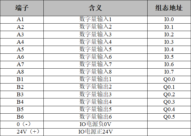GCAN-PLC-301/302自帶8路輸入,6路輸出的數(shù)字量模塊。默認(rèn)發(fā)貨PNP型,需單獨(dú)外接電源使用(與GCAN-PLC-301/302電源隔離)。其中A1~A4為數(shù)字量輸入與高速計數(shù)輸入復(fù)用;B1~B4為數(shù)字量輸出與PWM高速脈沖輸出復(fù)用。接線時使用一字端子接頭的線纜,將端子接頭對準(zhǔn)相應(yīng)通道的圓孔插入即可;拆線時,需使用一字螺絲刀,插入需拆線的通道對應(yīng)方形孔,用力向下按壓(也可輕微撬動),此時相應(yīng)圓孔中的夾片會松動,線纜可輕松拔出。