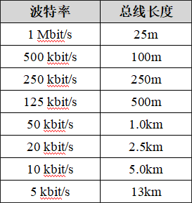 波特率與最大總線長度參照表
