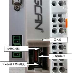 GCAN-PLC-301/302提供1個程序運(yùn)行開關(guān)、1個復(fù)位按鍵和一個編程接口。打開蓋板后實(shí)物圖如圖所示: